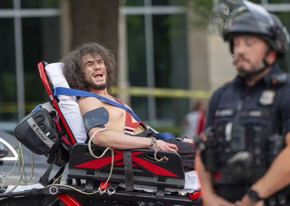 Arturo Gamboa is taken away in handcuffs on a gurney during the “No Kings” protest in Salt Lake City on Saturday, June 14, 2025. (Scott G. Winterton/The Deseret News via AP)