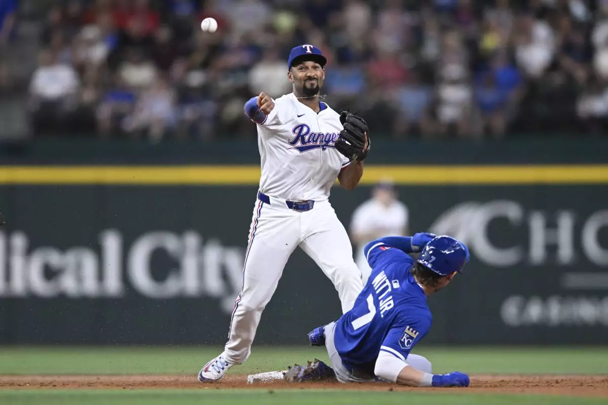 Texas Rangers second base Marcus Semien turns a double play over Kansas City Royals' Bobby Witt Jr. to put out Maikel Garcia at first in the third inning of a baseball game, Thursday, June 19, 2025, Arlington, Texas. (AP Photo/Albert Pena)