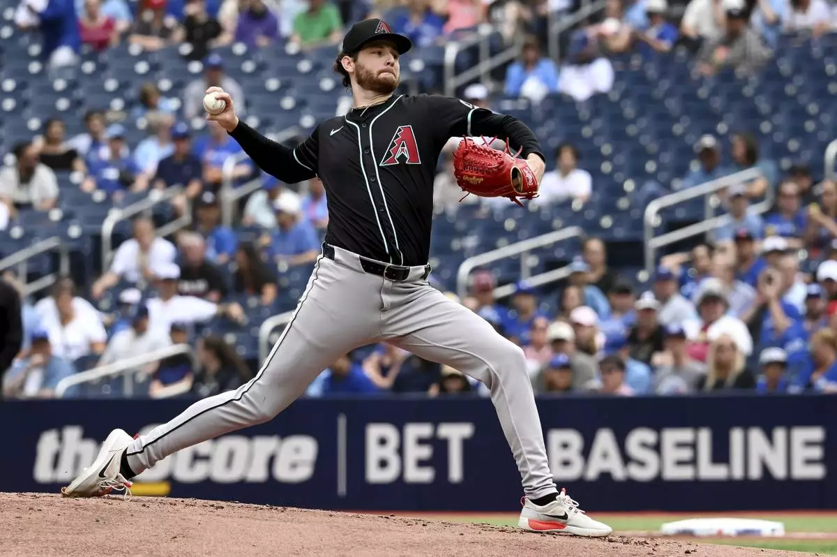 Arizona Diamondbacks relief pitcher Ryne Nelson throws to a Toronto Blue Jays batter in first-inning baseball game action in Toronto, Thursday, June 19, 2025. (Jon Blacker/The Canadian Press via AP)