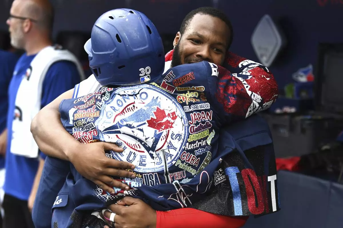 Toronto Blue Jays' Vladimir Guerrero Jr., right, celebrates in the dugout with Alejandro Kirk (30) after Kirk's solo home run against the Arizona Diamondbacks in second-inning baseball game action in Toronto, Thursday, June 19, 2025. (Jon Blacker/The Canadian Press via AP)