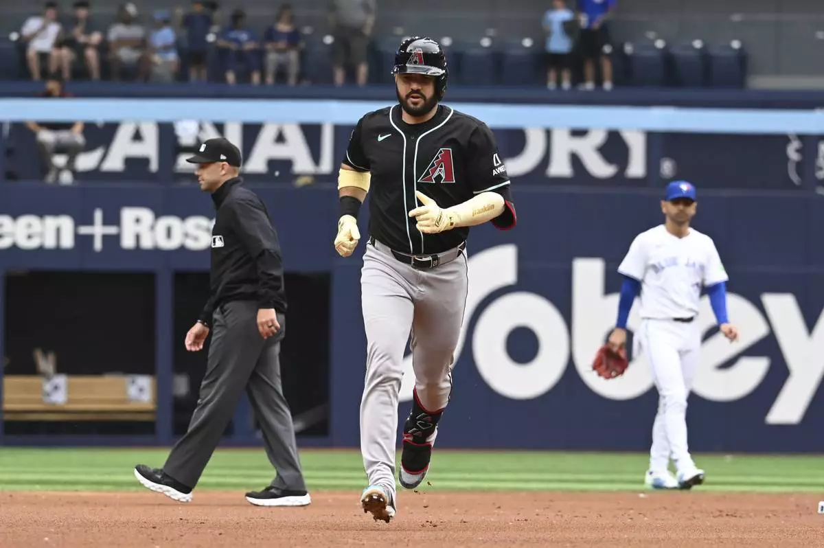 Arizona Diamondbacks' Eugenio Suarez, center, runs the bases after hitting a two-RBI home run against the Toronto Blue Jays in second-inning baseball game action in Toronto, Thursday, June 19, 2025. (Jon Blacker/The Canadian Press via AP)