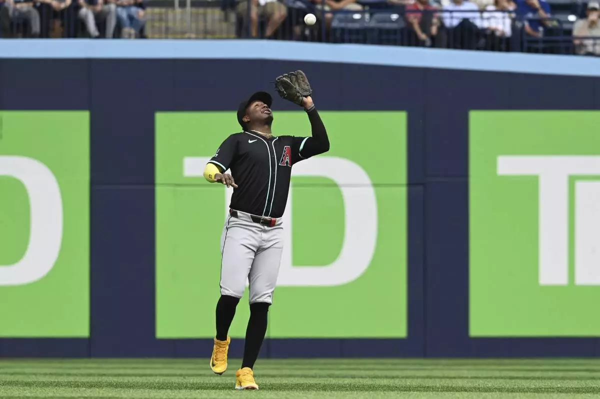Arizona Diamondbacks shortstop Geraldo Perdomo catches a fly ball off the bat of Toronto Blue Jays' Addison Barger in first-inning baseball game action in Toronto, Thursday, June 19, 2025. (Jon Blacker/The Canadian Press via AP)