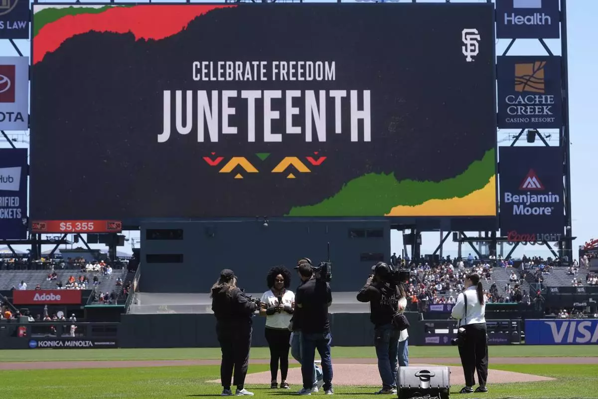 Lena Byrd-Miles, middle, prepares to sing Lift Every Voice, as part of the Juneteenth holiday, before a baseball game between the San Francisco Giants and the Cleveland Guardians in San Francisco, Thursday, June 19, 2025. (AP Photo/Jeff Chiu)