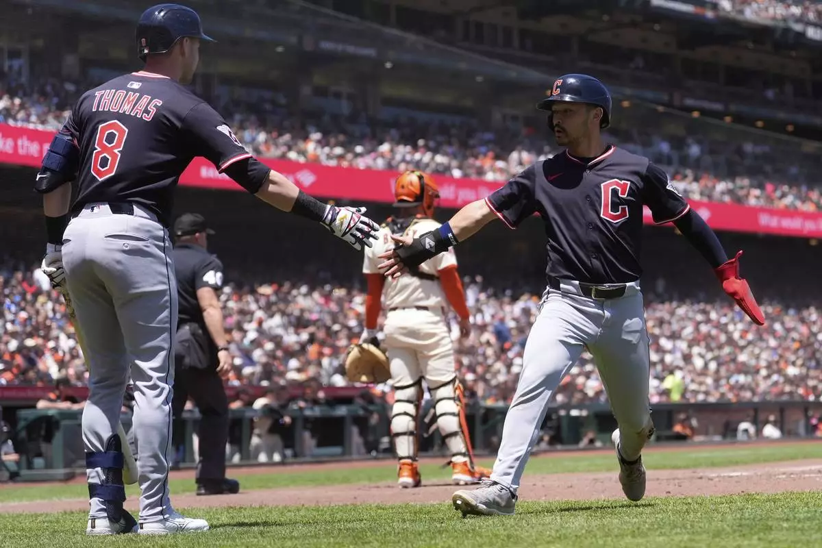 Cleveland Guardians' Steven Kwan, right, is congratulated by Lane Thomas (8) after scoring against the San Francisco Giants during the third inning of a baseball game in San Francisco, Thursday, June 19, 2025. (AP Photo/Jeff Chiu)