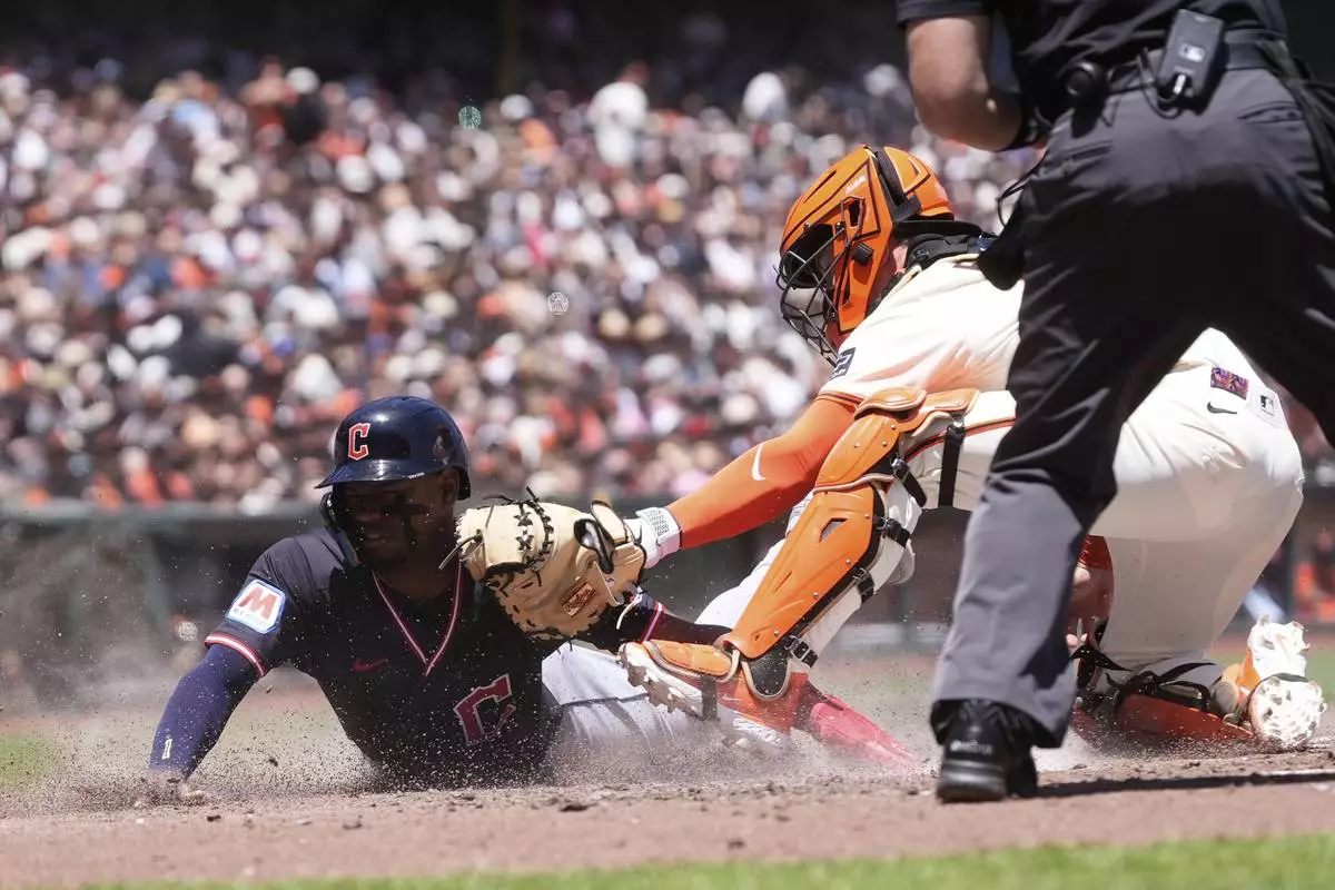 Cleveland Guardians' Angel Martínez, left, is tagged out at home by San Francisco Giants catcher Patrick Bailey during the third inning of a baseball game in San Francisco, Thursday, June 19, 2025. (AP Photo/Jeff Chiu)