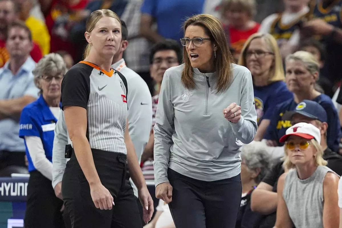 Indiana Fever head coach Stephanie White, right, talks with referee Jenna Reneau in the second half of a WNBA basketball game against the Connecticut Sun in Indianapolis, Tuesday, June 17, 2025. (AP Photo/Michael Conroy)