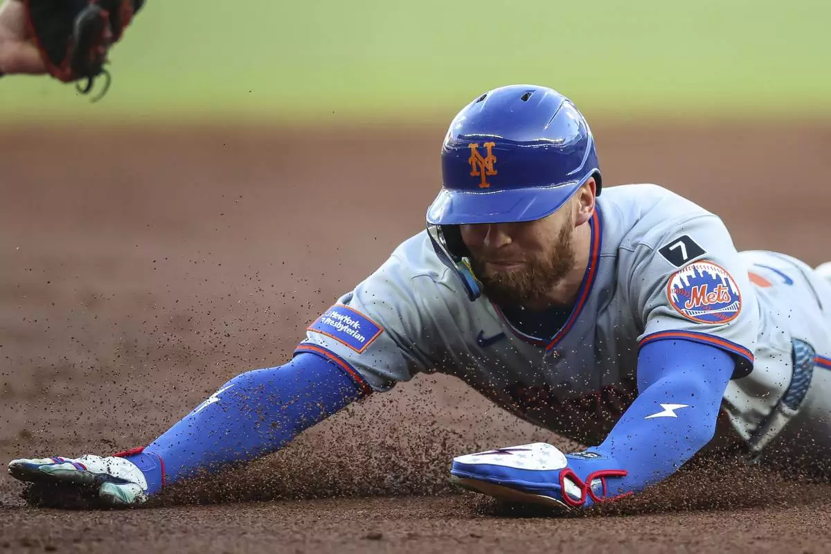 New York Mets' Brandon Nimmo steals third base in the third inning of a baseball game against the Atlanta Braves, Thursday, June 19, 2025, in Atlanta. (AP Photo/Colin Hubbard)