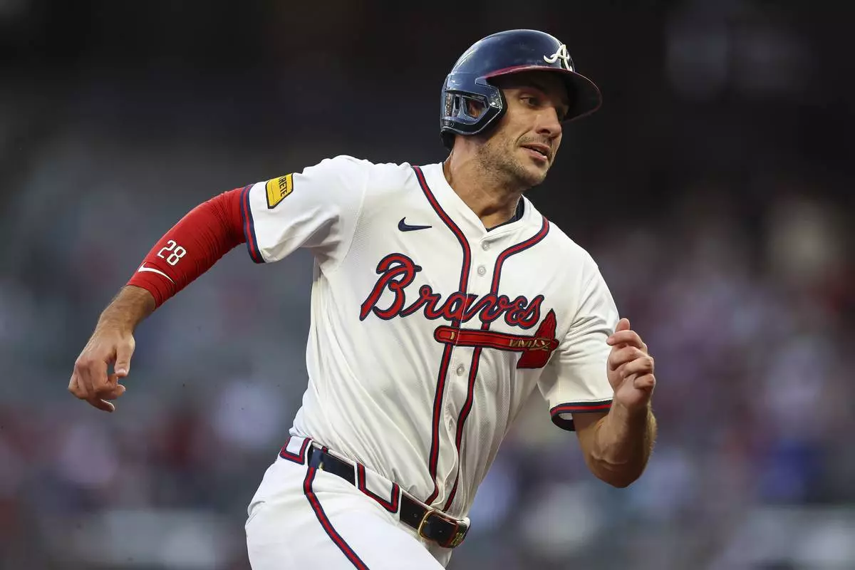 Atlanta Braves' Matt Olson rounds third base before scoring a run in the fourth inning of a baseball game against the New York Mets, Thursday, June 19, 2025, in Atlanta. (AP Photo/Colin Hubbard)