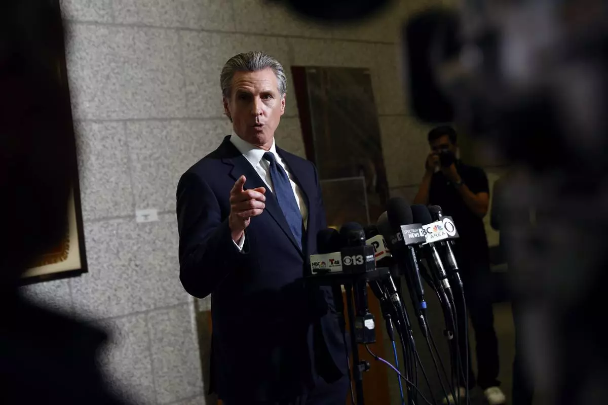 Gov. Gavin Newsom speaks after U.S. District Judge Charles Breyer granted an emergency temporary restraining to stop President Trump's deployment of the California National Guard, Thursday, June 12, 2025, at the California State Supreme Court building in San Francisco. (Santiago Mejia/San Francisco Chronicle via AP)
