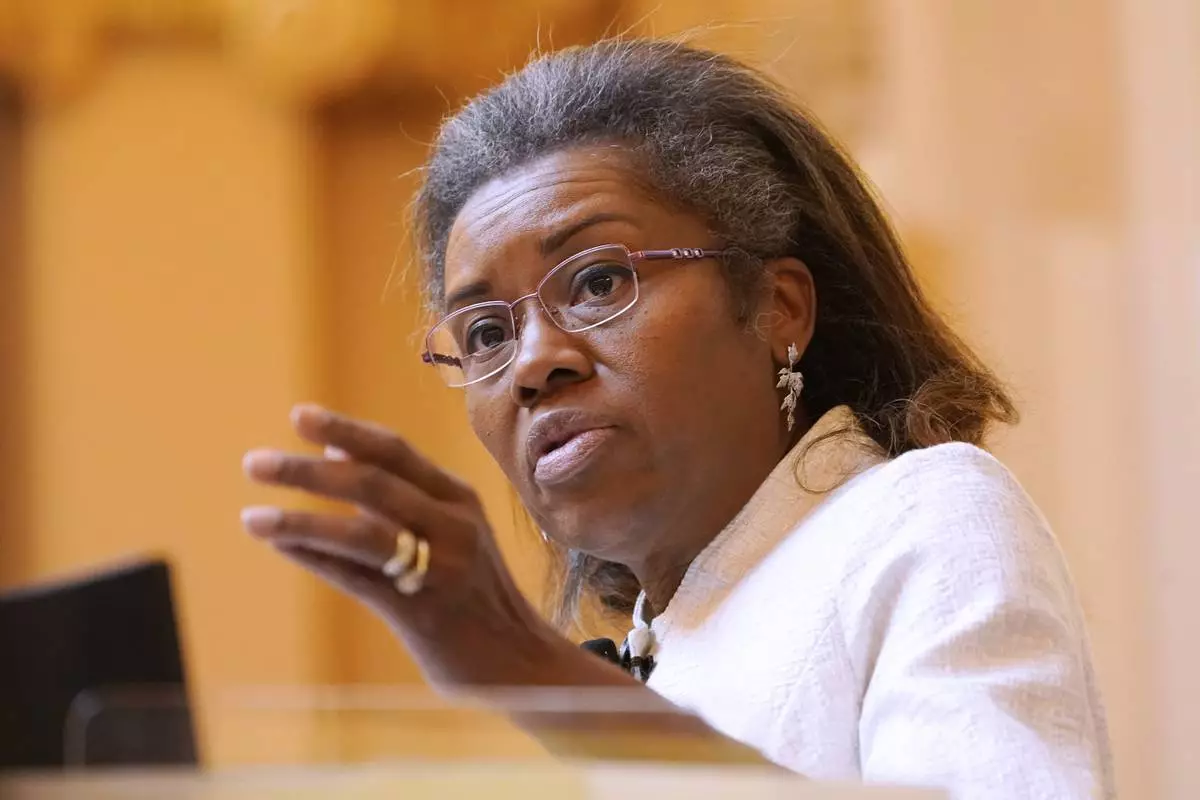 FILE - Virginia Lt. Gov. Winsome Earle-Sears gestures as she presides over the Senate during the session at the state Capitol on Feb. 8, 2022, in Richmond, Va. (AP Photo/Steve Helber, File)