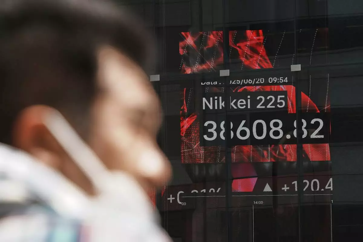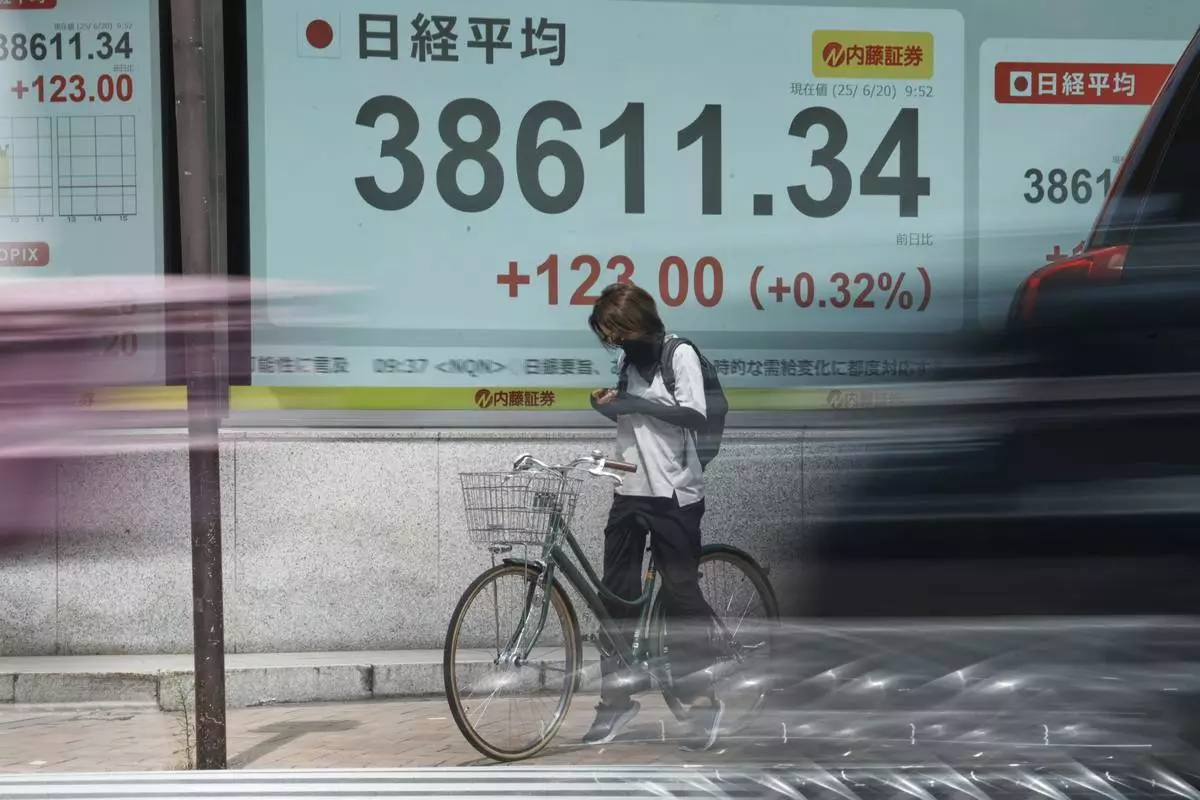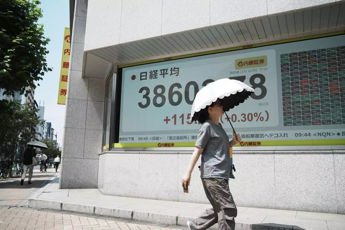 A person waits a traffic signal in front of an electronic stock board showing Japan's Nikkei index at a securities firm Friday, June 20, 2025, in Tokyo. (AP Photo/Eugene Hoshiko)