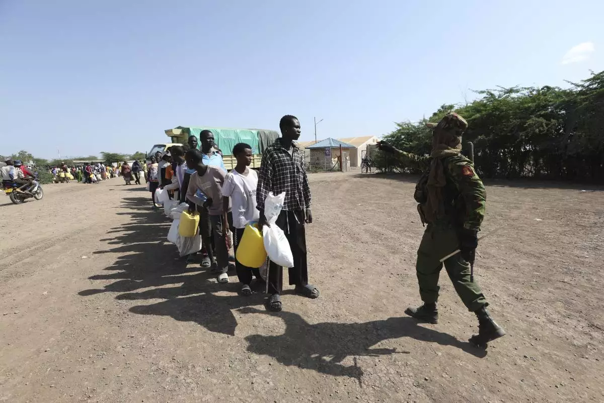 Refugees waiting in a queue to receive humanitarian aid distributed by the World Food Programme (WFP) at Kakuma Refugee Camp in Turkana, Kenya Wednesday, June 4, 2025. (AP Photo/Andrew)