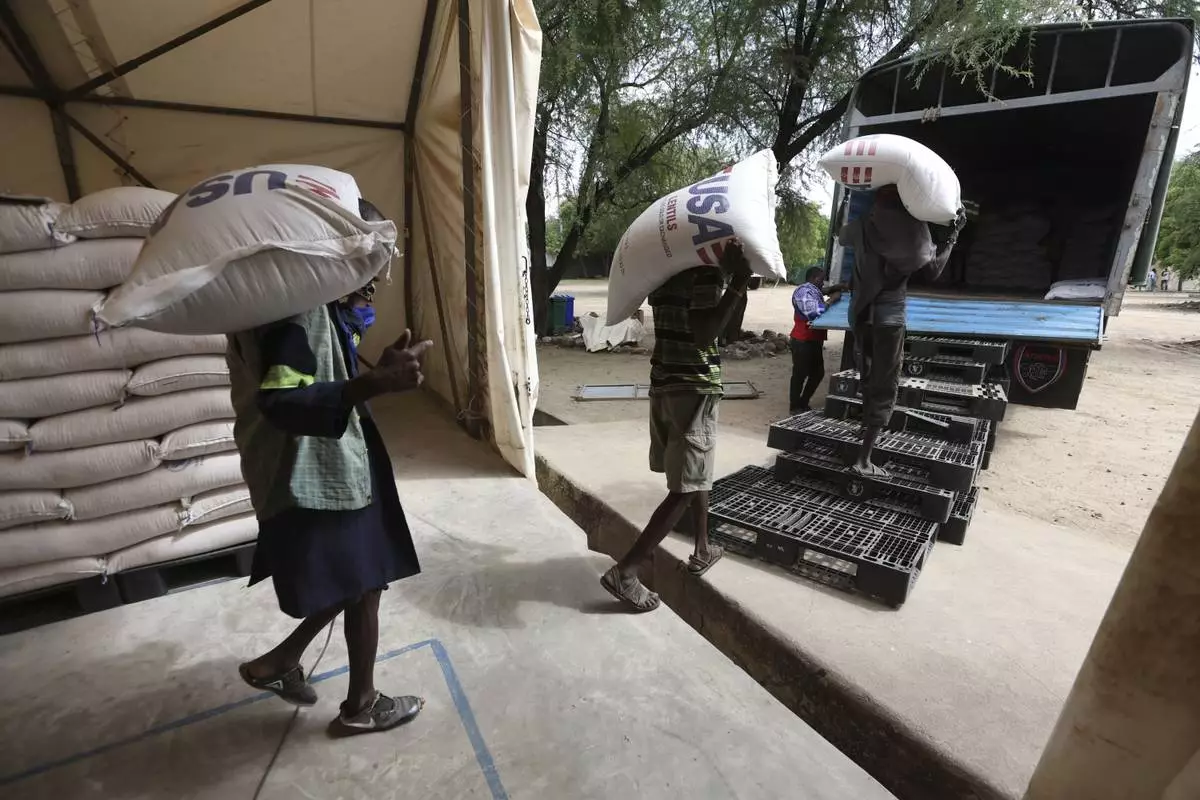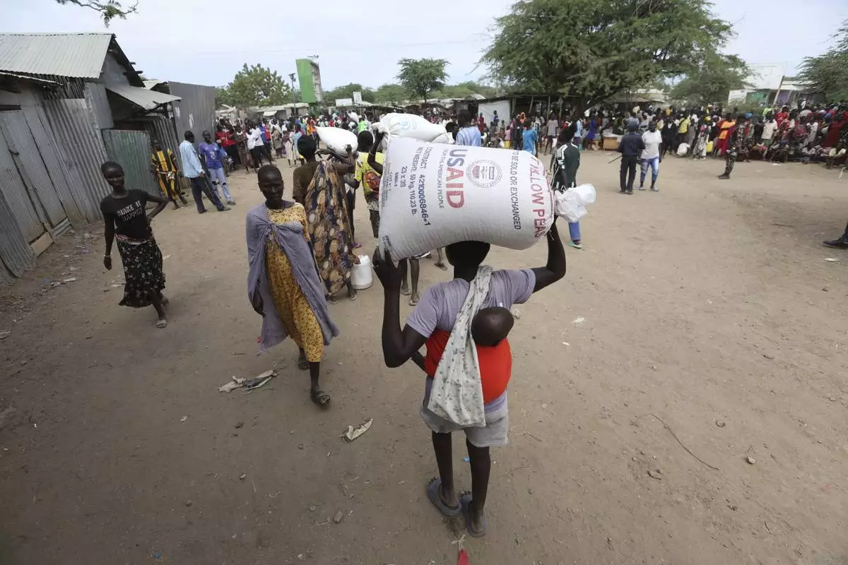Refugees carry food at a distribution center run by the World Food Programme (WFP) at Kakuma Refugee Camp in Turkana, Kenya Tuesday, June 3, 2025. (AP Photo/Andrew)