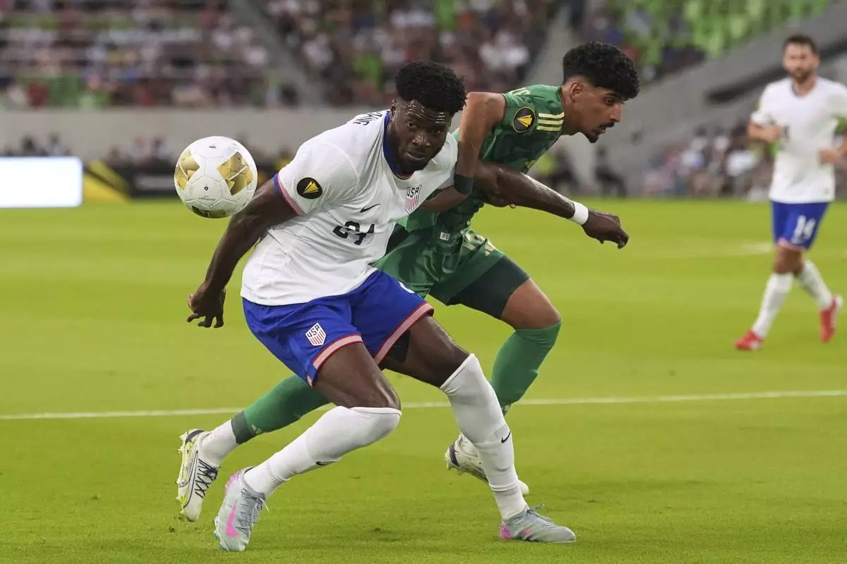 United States' Patrick Agyemang, left, and Saudi Arabia's Ziyad Aljohani, right, battle for control of the ball during a CONCACAF Gold Cup soccer match, Thursday, June 19, 2025, in Austin, Texas. (AP Photo/Eric Gay)