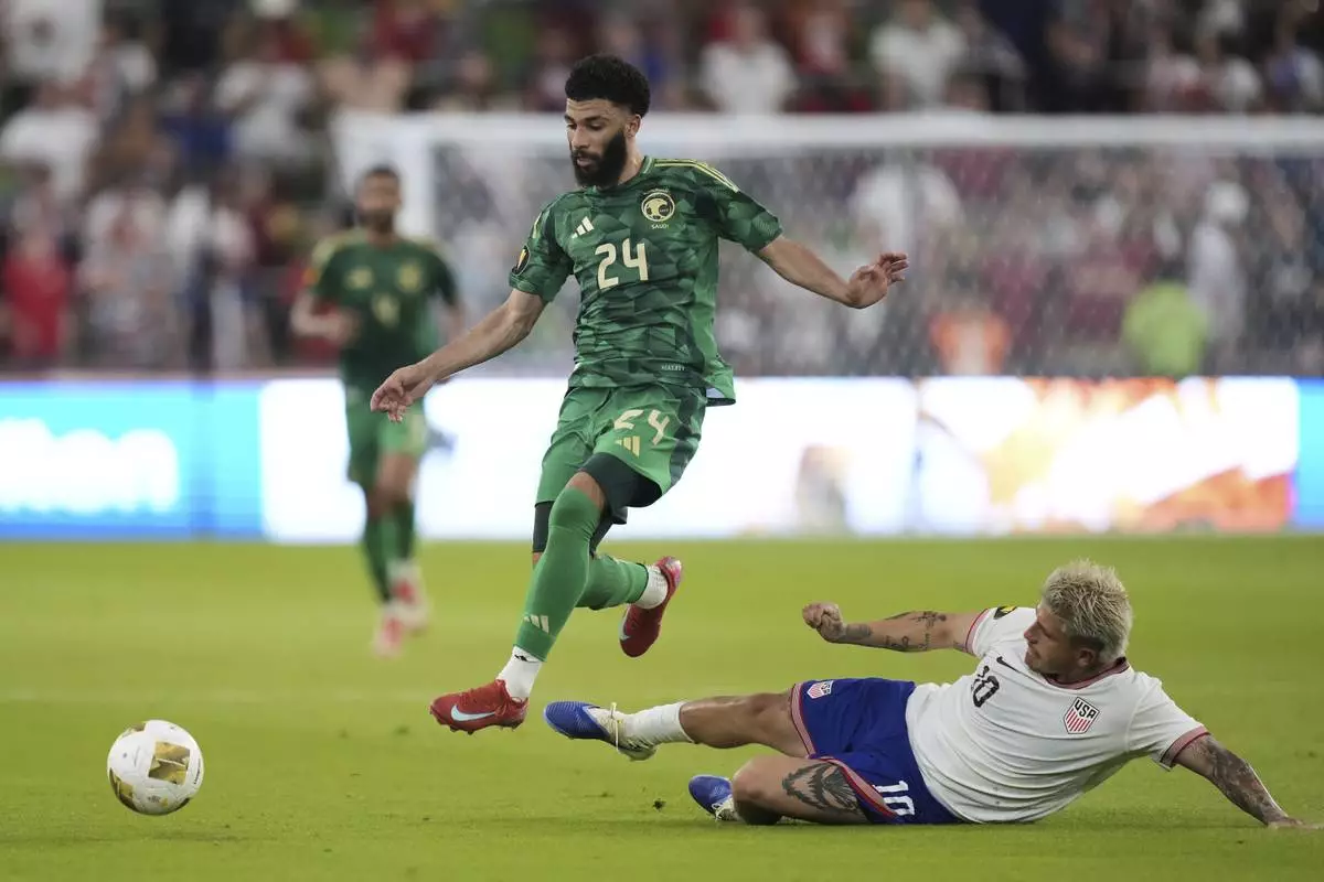 Saudi Arabia's Abdulrahman Aloboud (24) leaps over United States' Diego Luna (10) as he keeps control of the ball during a CONCACAF Gold Cup soccer match, Thursday, June 19, 2025, in Austin, Texas. (AP Photo/Eric Gay)