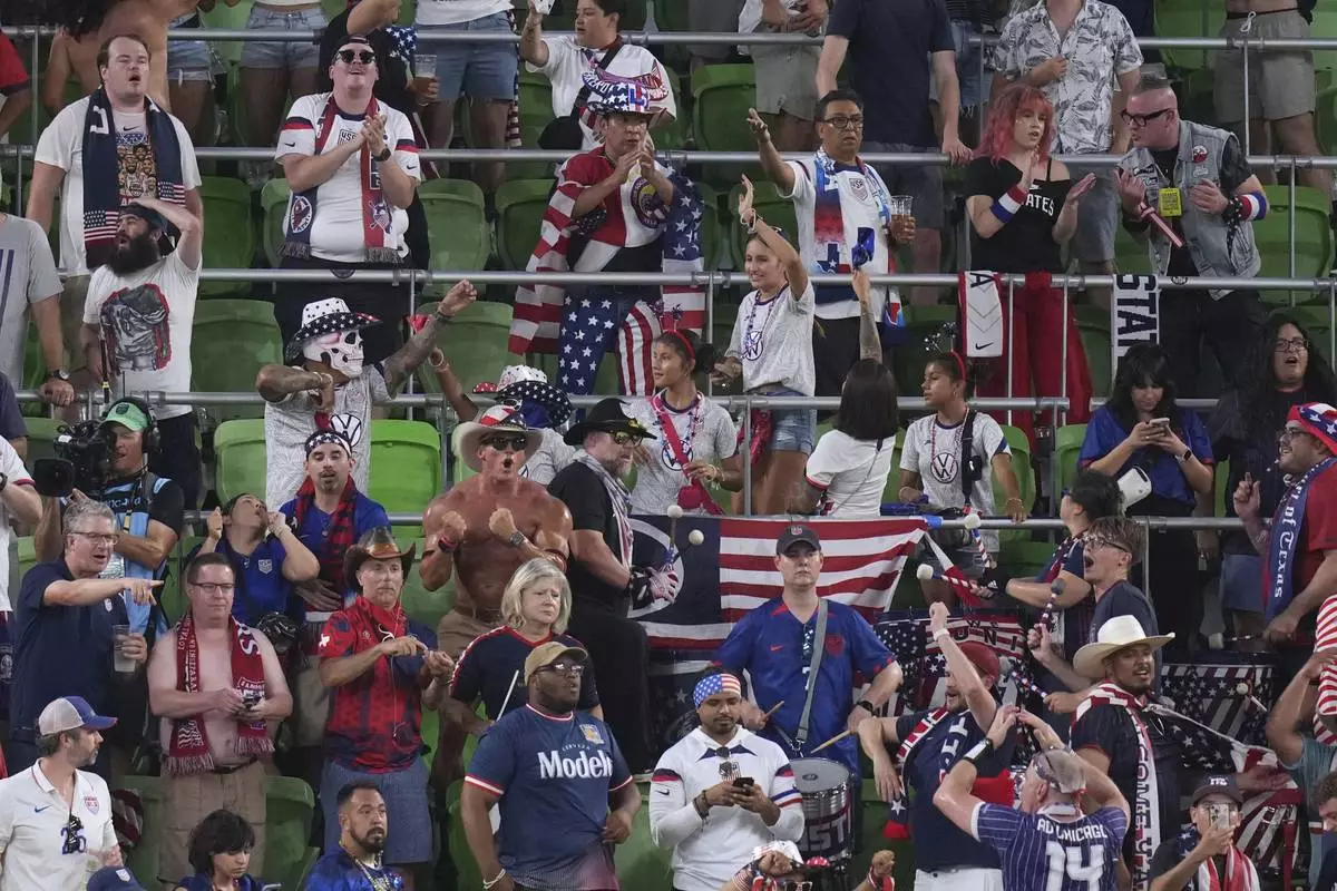 Fans celebrate after United States' Chris Richards scores against Saudi Arabia during a CONCACAF Gold Cup soccer match, Thursday, June 19, 2025, in Austin, Texas. (AP Photo/Eric Gay)