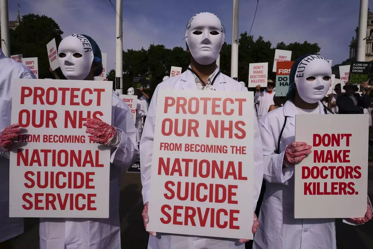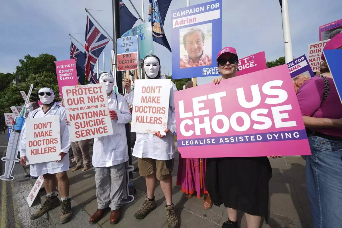 Campaigners supporting and opposing the assisted dying Bill demonstrate at Parliament Square, Westminster, central London, ahead of a debate on the Terminally Ill Adults (End of Life) Bill in the House of Commons, Friday, June 20, 2025. ( Lucy North//PA via AP)