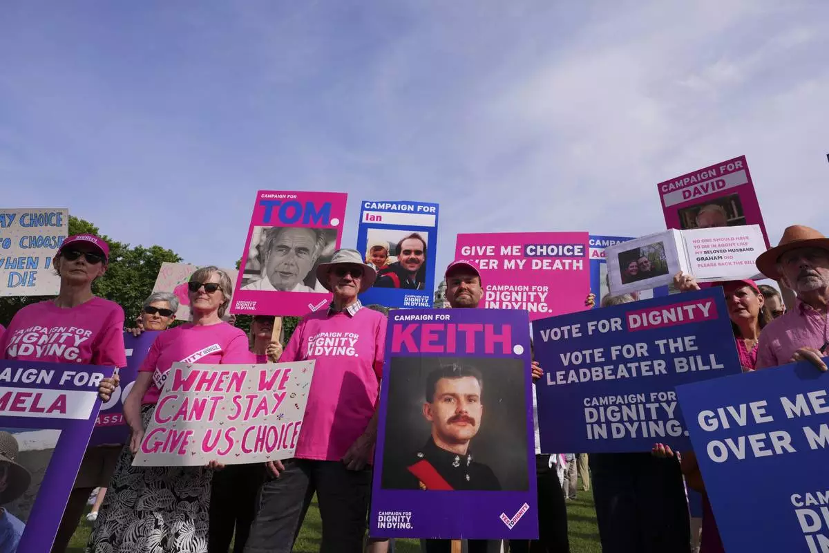 FILE -Banners are held by pro-assisted dying campaigners as they gather outside Parliament ahead of Fridays report stage in the Commons on The Terminally Ill Adults (End of Life) Bill which is expected to see MPs vote on further amendments, in Westminster in London, May 15, 2025. (AP Photo/Kirsty Wigglesworth, File)