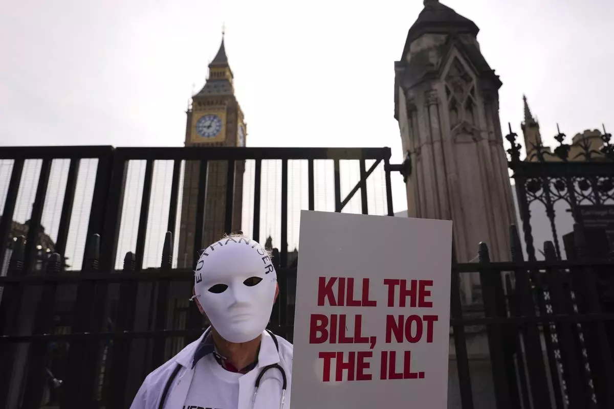 A demonstrator against assisted dying holds a banner outside Parliament in London, Friday, June 20, 2025, as British lawmakers are set to vote Friday on whether to back a bill to help terminally ill adults end their lives in England and Wales. (AP Photo/Kirsty Wigglesworth)