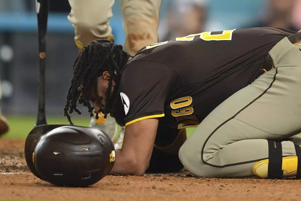 San Diego Padres' Fernando Tatis Jr. kneels on the ground after being hit by a pitch during the ninth inning of a baseball game against the Los Angeles Dodgers, Thursday, June 19, 2025, in Los Angeles. (AP Photo/Mark J. Terrill)