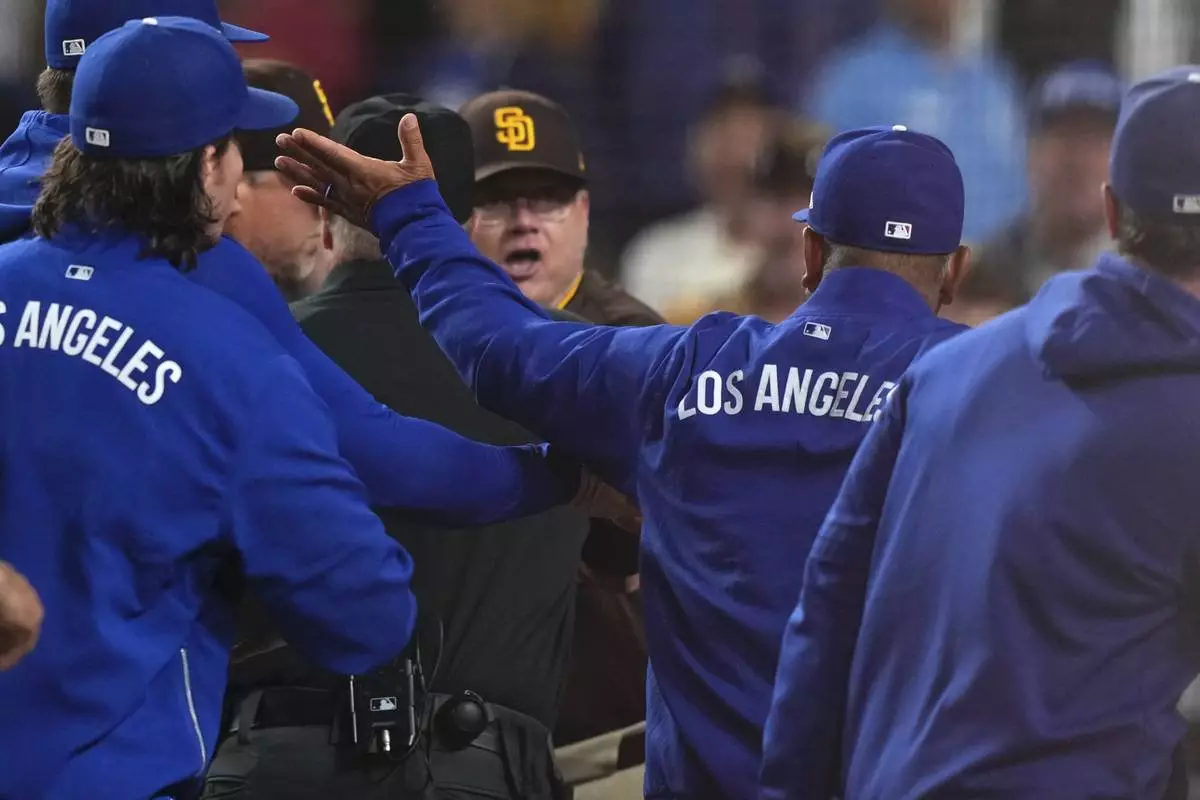 San Diego Padres manager Mike Shildt, center, and Los Angeles Dodgers manager Dave Roberts yell at each other after Padres' Fernando Tatis Jr. was hit by a pitch during the ninth inning of a baseball game Thursday, June 19, 2025, in Los Angeles. (AP Photo/Mark J. Terrill)