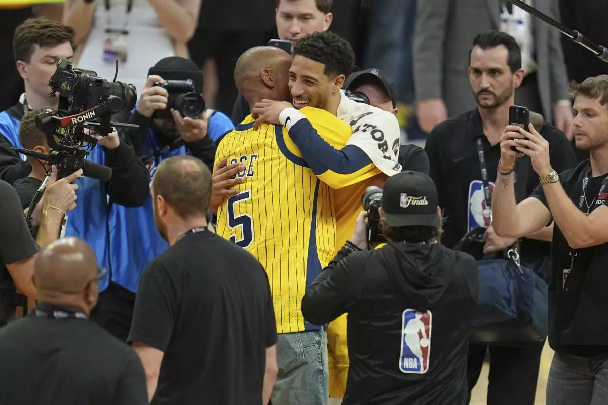Indiana Pacers guard Tyrese Haliburton hugs NBA hall of fame Reggie Miller, left, after Game 6 of the NBA Finals basketball series against the Oklahoma City Thunder, Thursday, June 19, 2025, in Indianapolis. (AP Photo/Michael Conroy)