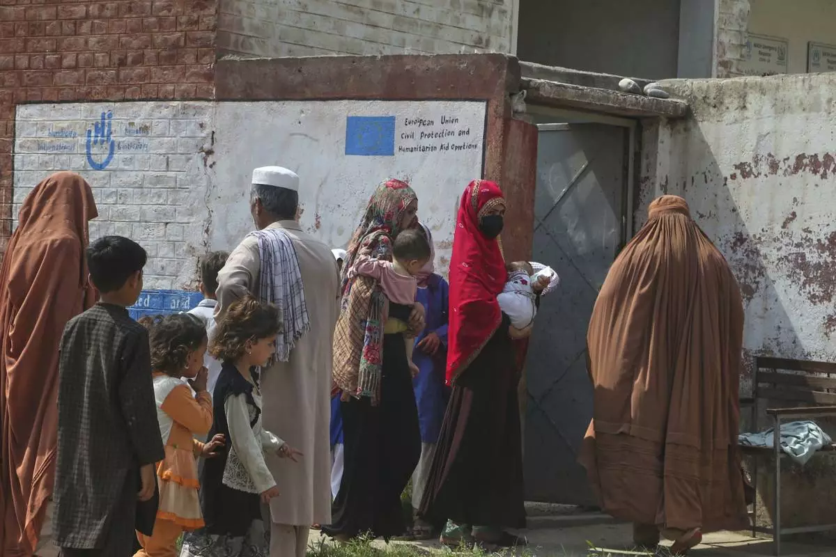 FILE - Afghan refugee women enter a health center at Kababayan Refugee Camp in Peshawar, Pakistan, on April 8, 2025. (AP Photo/Muhammad Sajjad, File)