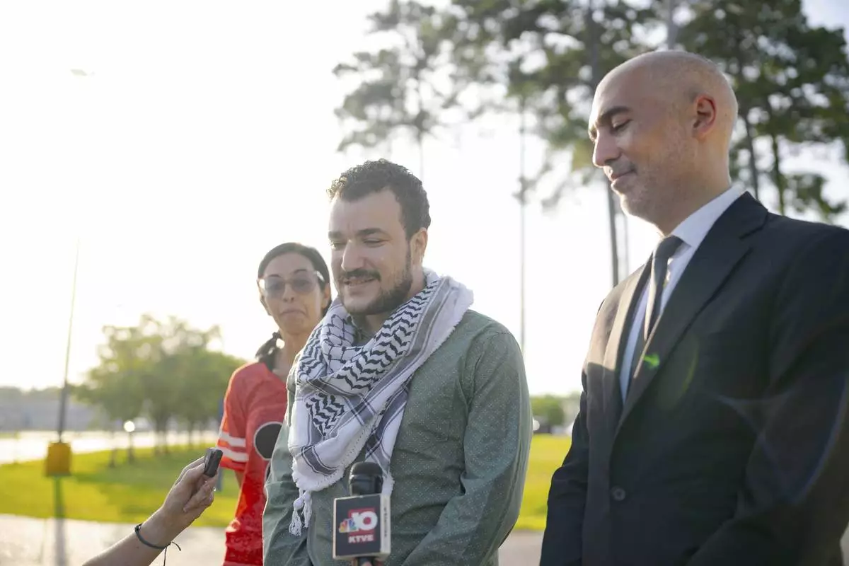 Palestinian activist Mahmoud Khalil, center, speaks after his release from federal immigration detention in Jena, La., Friday, June 20, 2025. (AP Photo/Matthew Hinton)
