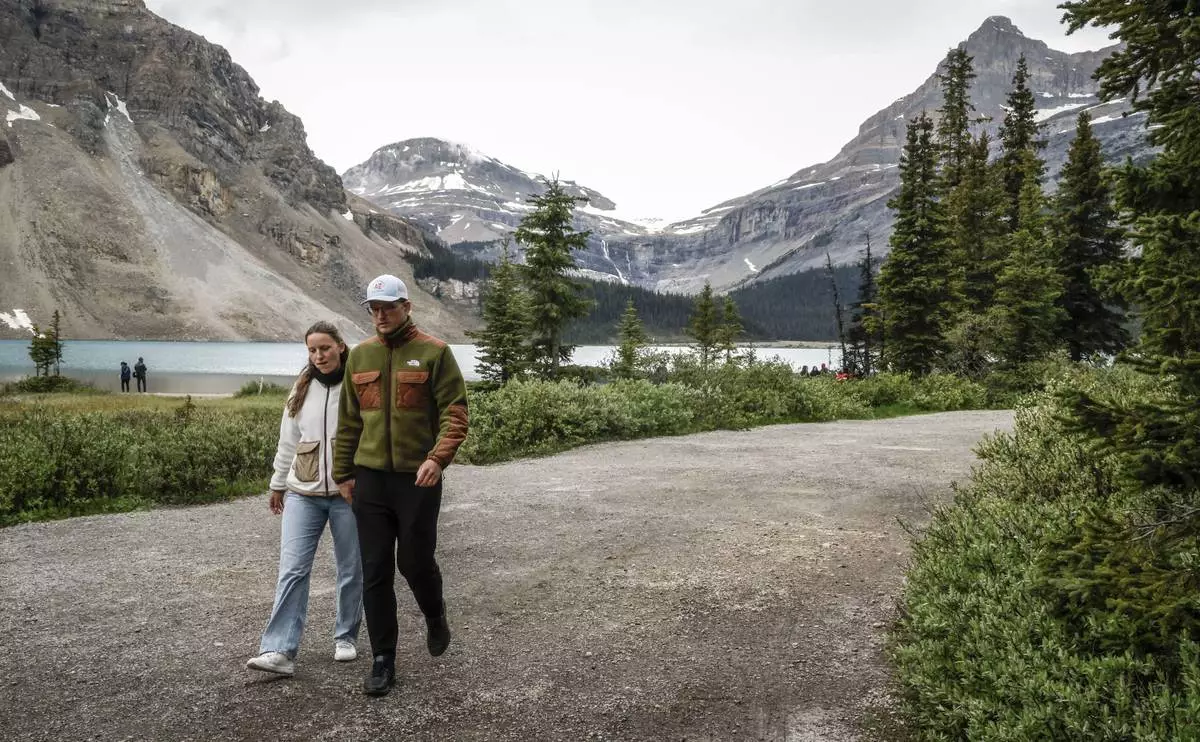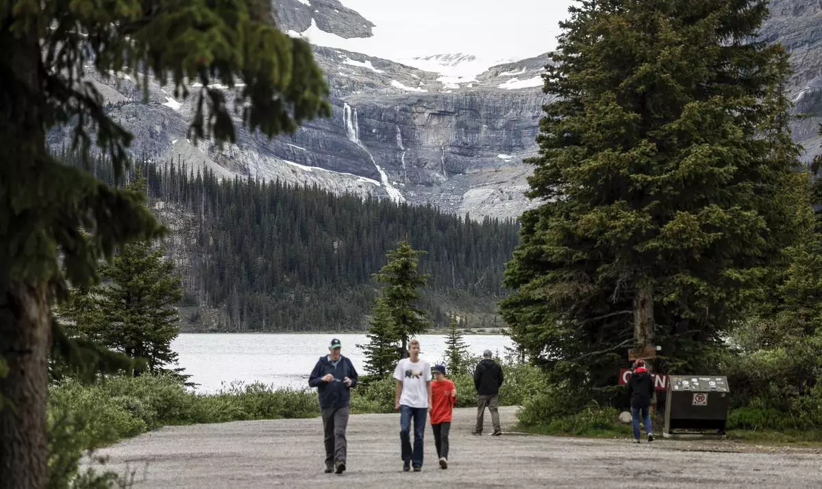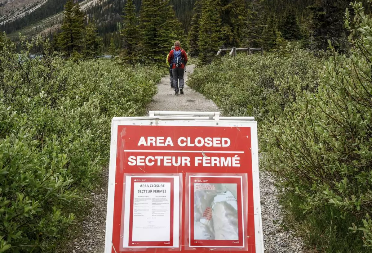 Hikers ignore a closed sign that blocks the trail to Bow Glacier Falls north of Lake Louise, Alta., in Banff National Park on Friday, June 20, 2025. (Jeff McIntosh/The Canadian Press via AP)