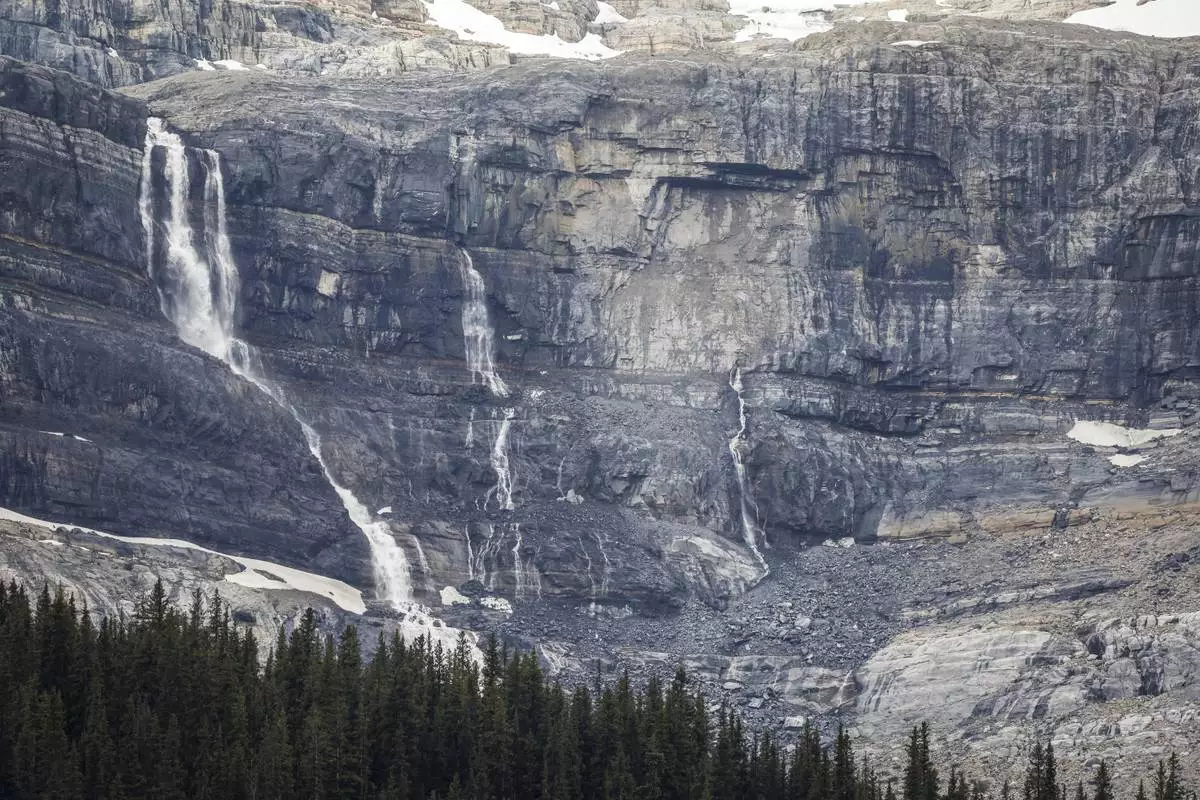 A rock slide, center light grey area, is shown near Bow Glacier Falls north of Lake Louise, Alta., in Banff National Park on Friday, June 20, 2025. (Jeff McIntosh/The Canadian Press via AP)