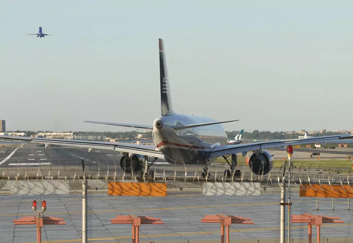 FILE - An aircraft takes off while another waits at LaGuardia Airport, on Aug. 26, 2008, in New York. (AP Photo/Edouard H.R. Gluck, File)
