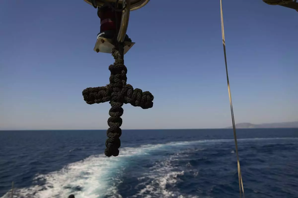A cross hangs on a Greek coast guard vessel during a patrol in the Aegean Sea between the Greek island of Lesbos and Turkey, Tuesday, May 13, 2025. (AP Photo/Petros Giannakouris)