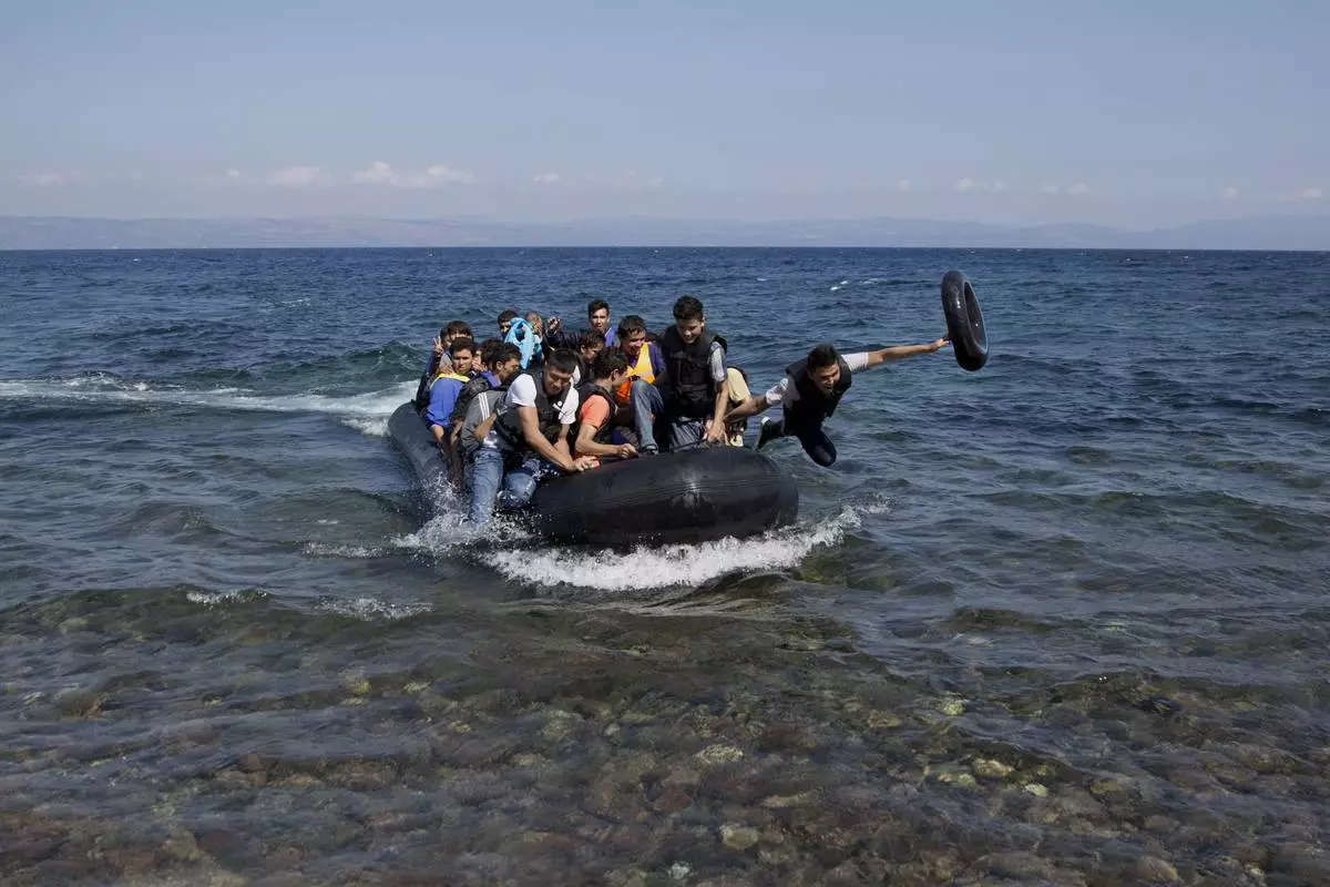 FILE - Migrants and refugees arrive on a dinghy after crossing from Turkey to Lesbos island, Greece, Sept. 9, 2015. (AP Photo/Petros Giannakouris, File)