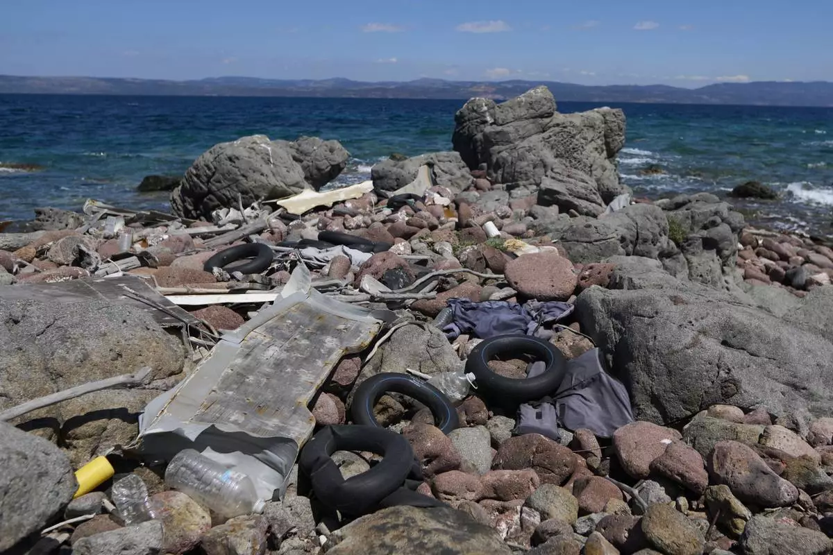 An abandoned dinghy used by refugees and migrants while crossing from Turkey to Greece is seen on cape Korakas, Wednesday, May 14, 2025. (AP Photo/Petros Giannakouris)