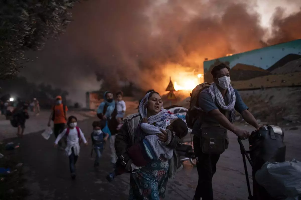 FILE - Refugees and migrants carrying children and belongings flee a fire burning at the Moria camp on the northeastern Aegean island of Lesbos, Greece on Wednesday, Sept. 9, 2020. (AP Photo/Petros Giannakouris, File)