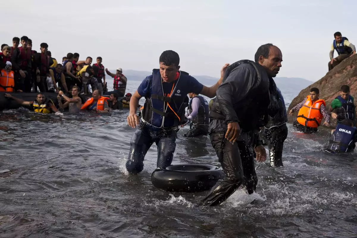 FILE - Afghan migrants arrive on the shores of the Greek island of Lesbos after crossing the Aegean sea from Turkey on a inflatable dinghy, Friday, Sept. 25, 2015. (AP Photo/Petros Giannakouris, File)