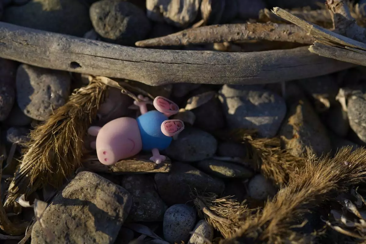 George Pig, a figure toy from Peppa Pig cartoon, is seen in Skala Sykamias shores, a small village on Lesbos, Greece, Wednesday, May 14, 2025. (AP Photo/Petros Giannakouris)