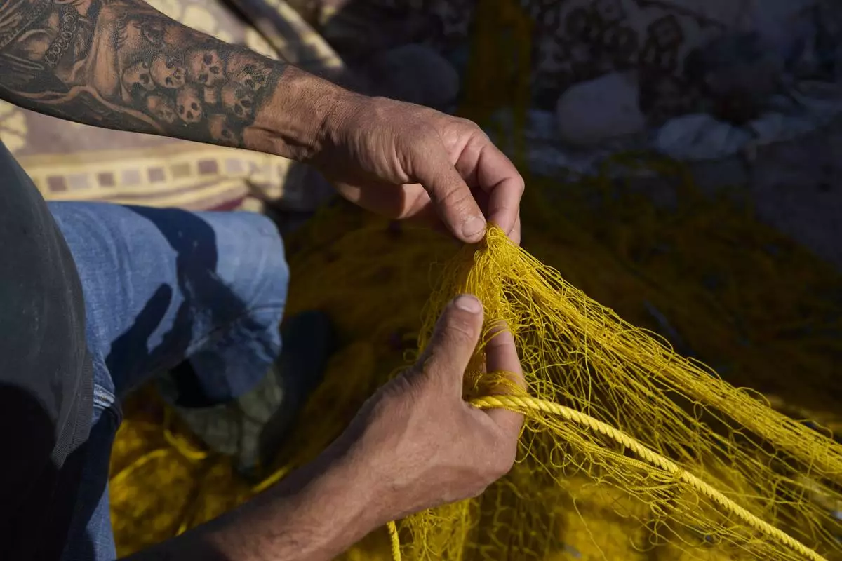 Fisherman Stratos Valamios untangles the nets at the village of Skala Sikamias, on the Greek island of Lesbos, Thursday, May 15, 2025. (AP Photo/Petros Giannakouris)