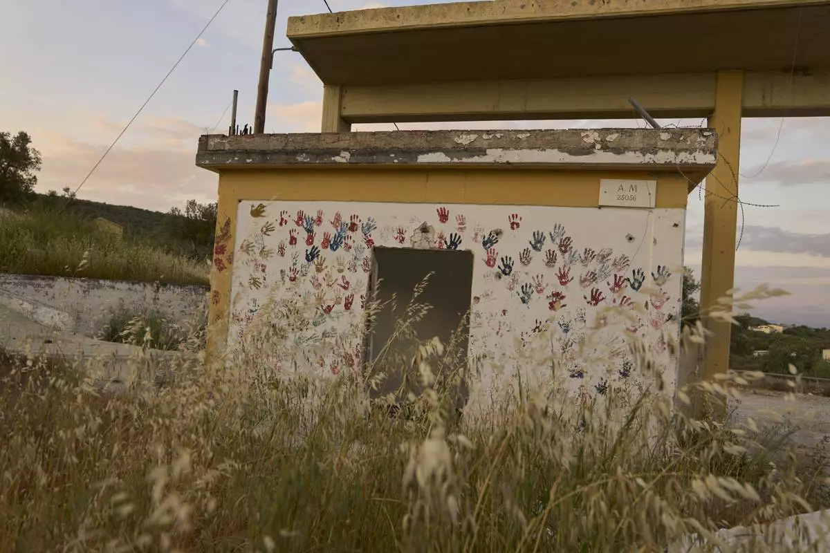 Colorful handprints are seen on the wall of a small structure in the remains of the former Moria refugee camp, which was destroyed by a massive fire in September 2020, on the island of Lesbos, Greece, Monday, May 12, 2025. (AP Photo/Petros Giannakouris)