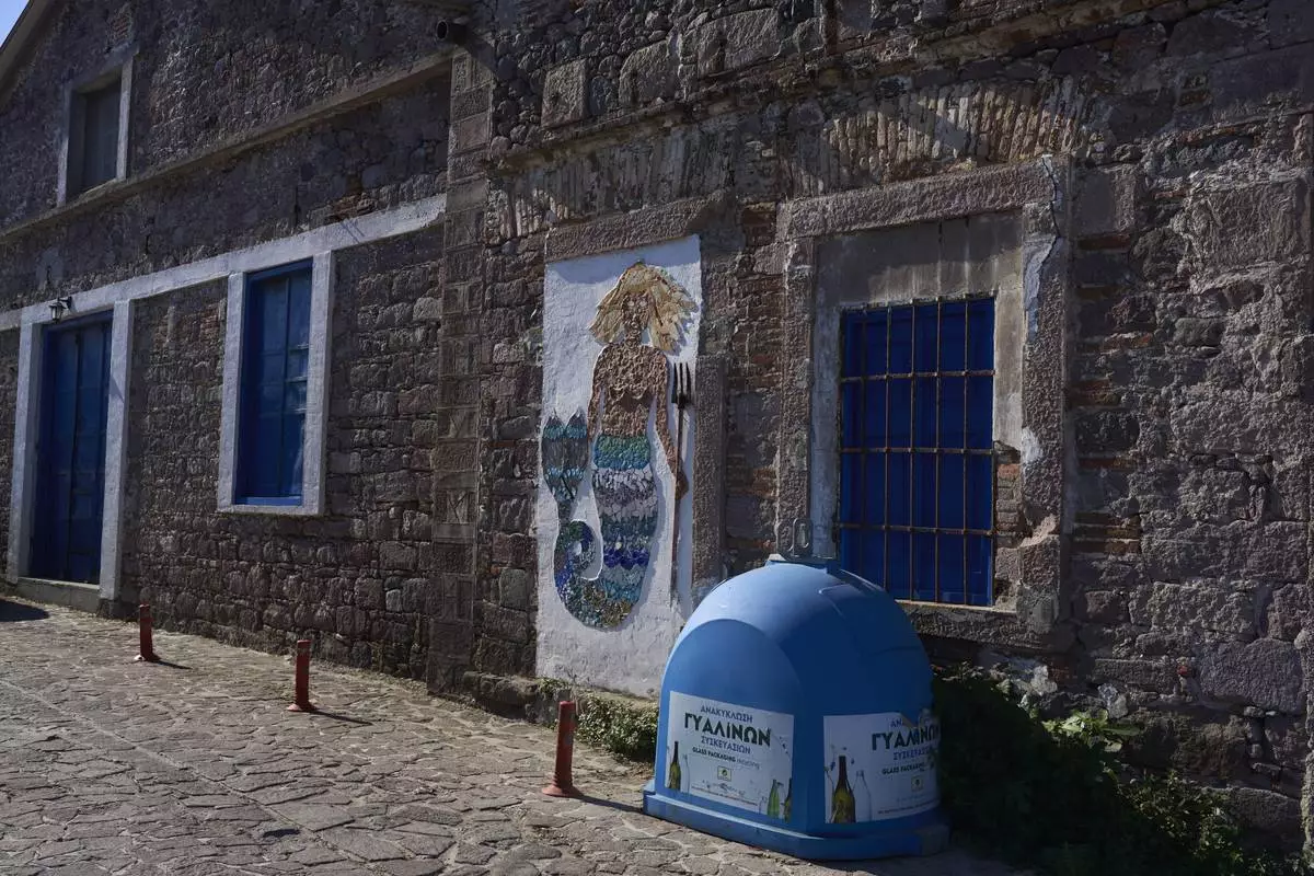 A mermaid mosaic by artist Yioula Koutsoubou and Humade Crafts Workshop is seen on the wall of Skala Sikamias village, on the Greek island of Lesbos, Thursday, May 15, 2025. (AP Photo/Petros Giannakouris)