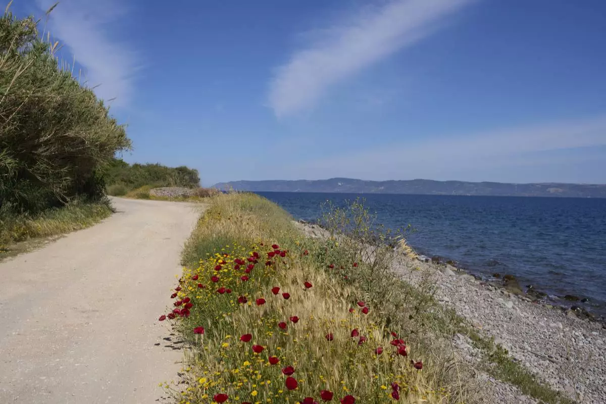 Flowers bloom along the shore of Skala Sikamias, where thousands of refugees arrived by dinghies from Turkey during the height of the migrant crisis a decade ago, on the Greek island of Lesbos, Thursday, May 15, 2025. (AP Photo/Petros Giannakouris)