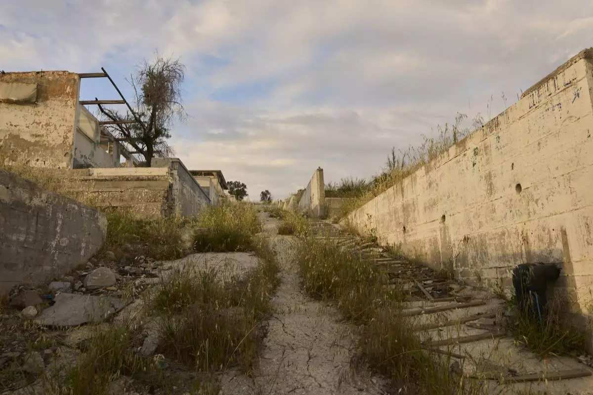 The remains of the former Moria refugee camp, which was destroyed by a massive fire in 2020, are seen on the island of Lesbos, Greece, on May 12, 2025. (AP Photo/Petros Giannakouris)