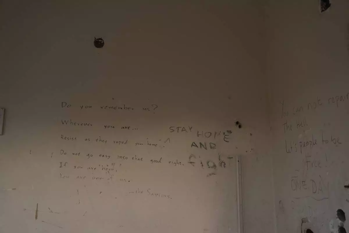 Messages scrawled on the wall of a building in the remains of the former Moria refugee camp, which was destroyed by a massive fire on 2020, are seen on the island of Lesbos, Greece, Monday, May 12, 2025. (AP Photo/Petros Giannakouris)