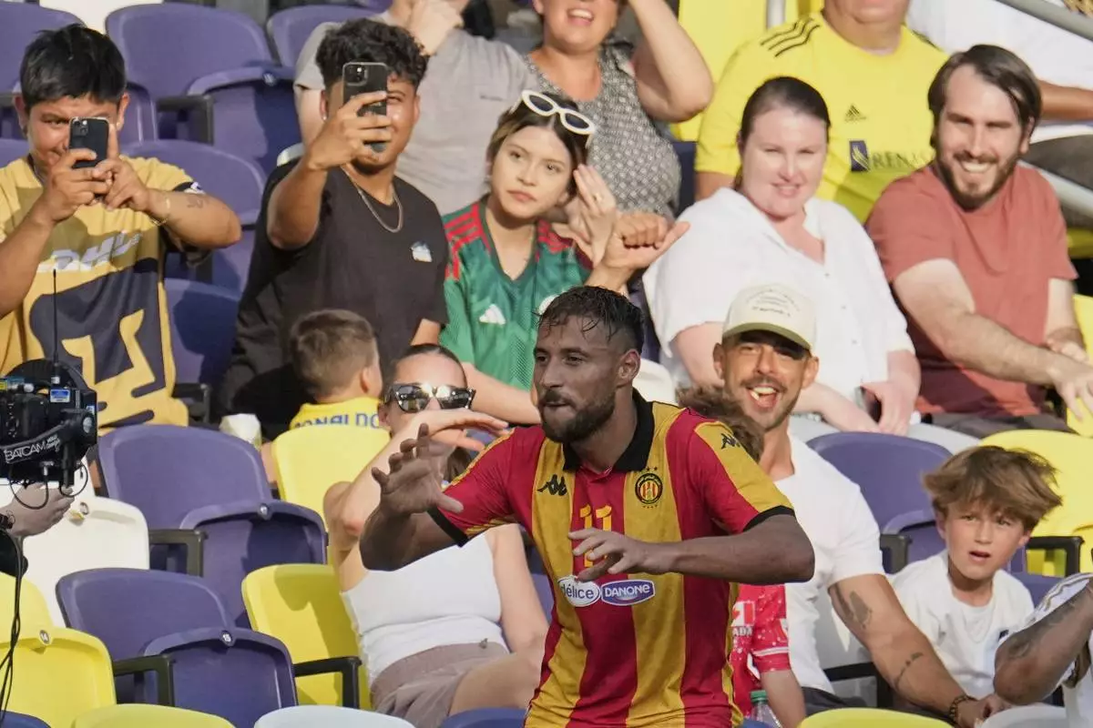 Esperance de Tunis' Youcef Belaili celebrates with fans after scoring his team's first goal during the Club World Cup Group D soccer match between Los Angeles FC and ES Tunisie in Nashville, Tenn., Friday, June 20, 2025. (AP Photo/George Walker IV)