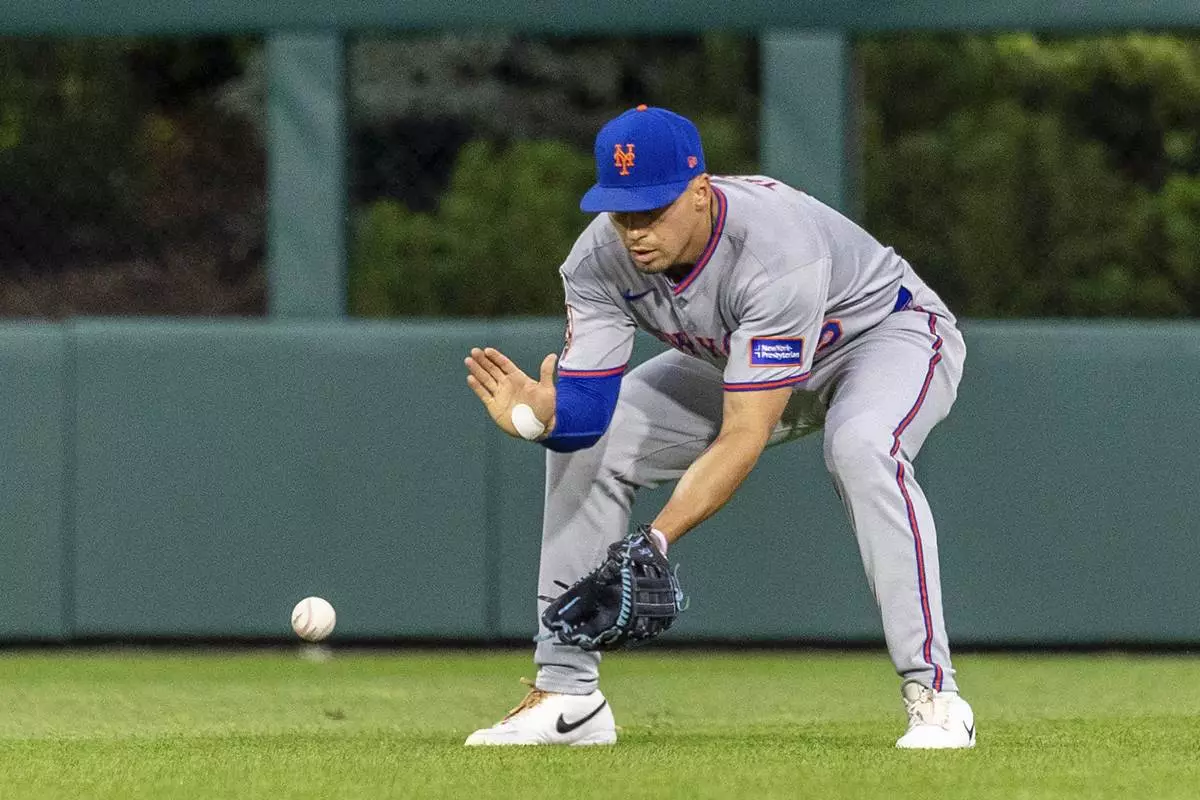 New York Mets outfielder Tyrone Taylor fields a single from Philadelphia Phillies' Nick Castellanos in the fourth inning of a baseball game, Friday, June 20, 2025, in Philadelphia. (AP Photo/Laurence Kesterson)
