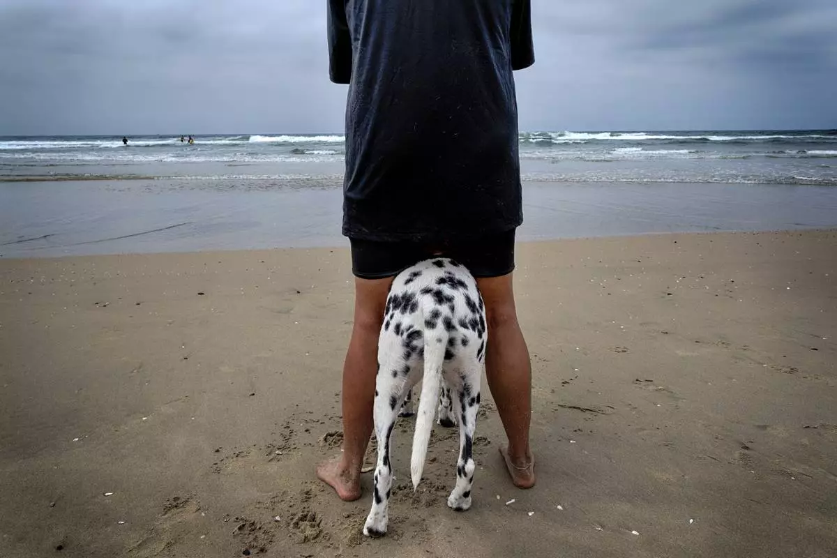 Joanne Owen and her 4-year-old Dalmatian Bentley watch as Bentley's sister Bailey competes in the annual Incredible Dog Challenge western regional surfing competition in Huntington Beach, Calif., Friday, June 20, 2025. (AP Photo/Richard Vogel)