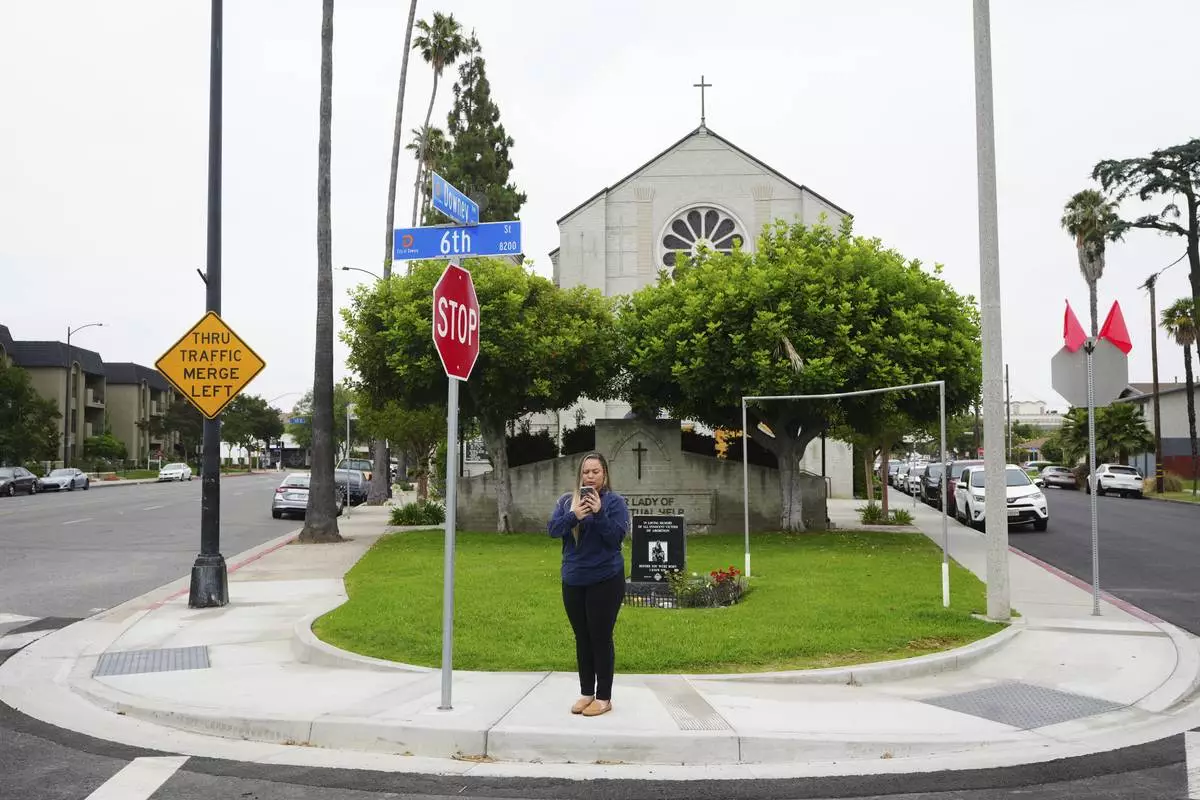 Melyssa Rivas stands at an intersection where she witnessed masked federal agents detaining a person earlier this month outside Our Lady of Perpetual Help Catholic Church in Downey, Calif., on Friday, June 20, 2025. (AP Photo/Damian Dovarganes)