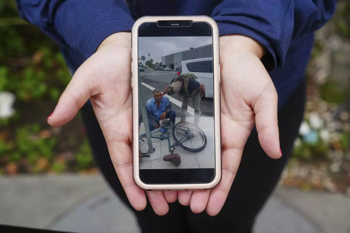 Melyssa Rivas shows her video of masked federal agents detaining a person earlier this month outside Our Lady of Perpetual Help Catholic Church in Downey, Calif., on Friday, June 20, 2025. (AP Photo/Damian Dovarganes)