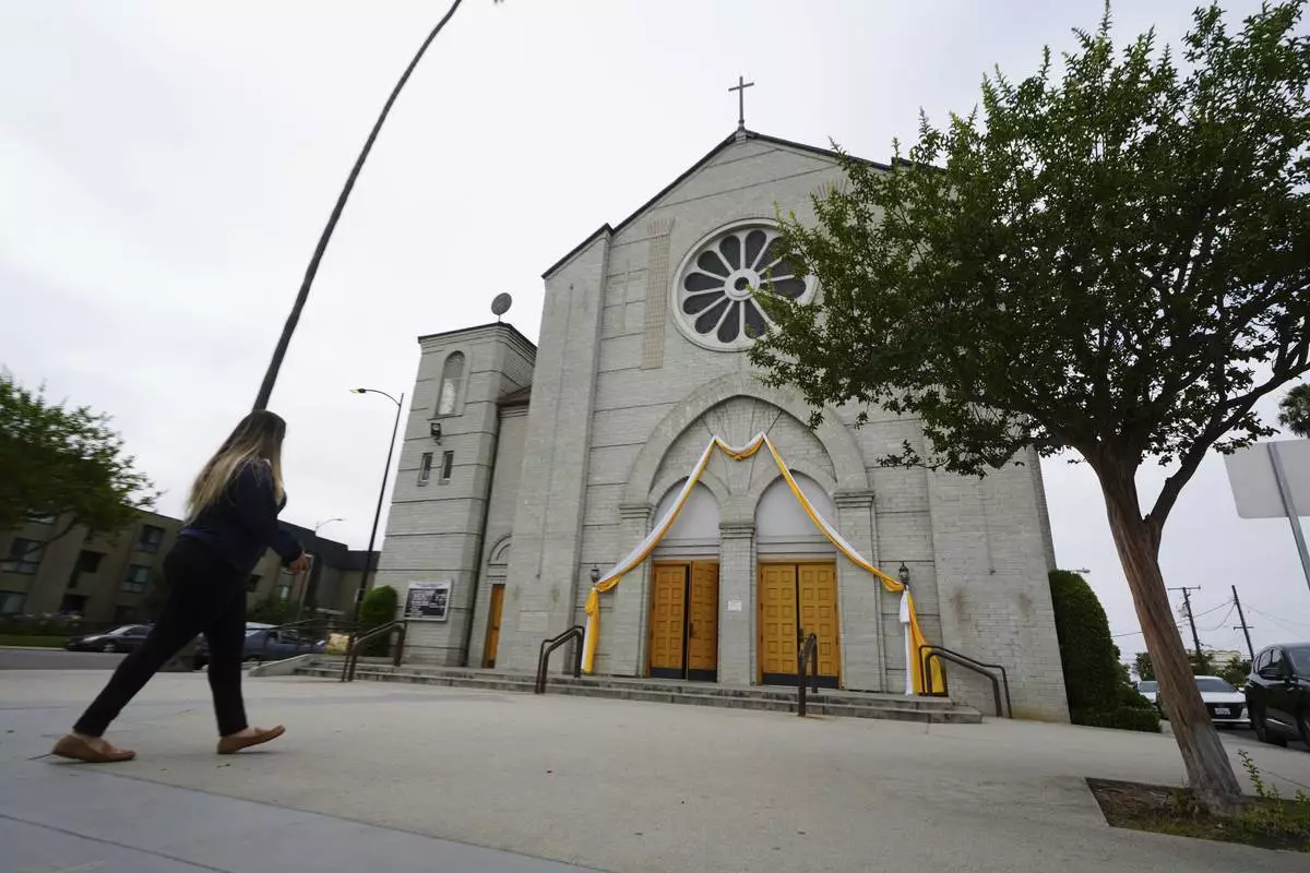 Melyssa Rivas walks outside a location where she witnessed masked federal agents detaining a person earlier this month outside Our Lady of Perpetual Help Catholic Church in Downey, Calif., on Friday, June 20, 2025. (AP Photo/Damian Dovarganes)
