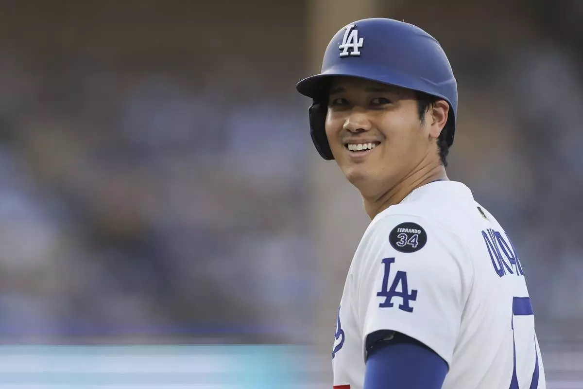 Los Angeles Dodgers designated hitter Shohei Ohtani reacts on base during the first inning of a baseball game against the Washington Nationals in Los Angeles, Friday, June 20, 2025. (AP Photo/Jessie Alcheh)